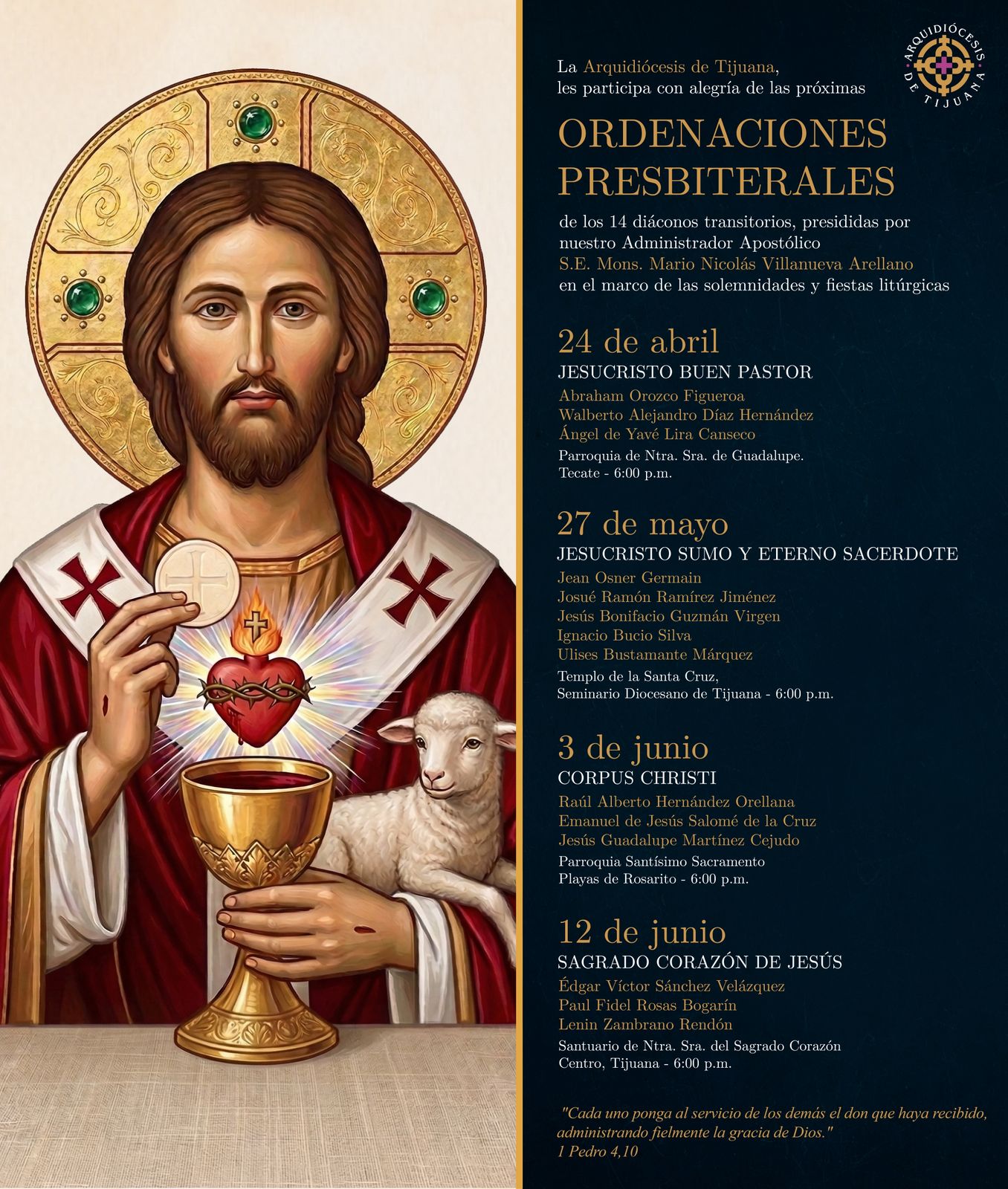 La Arquidiócesis de Tijuana comparte con gran alegría con todo el Pueblo de Dios las próximas Ordenaciones Presbiterales de 14 diáconos transitorios, que serán presididas por nuestro Administrador Apostólico, S.E. Mons. Mario Nicolás Villanueva Arellano.