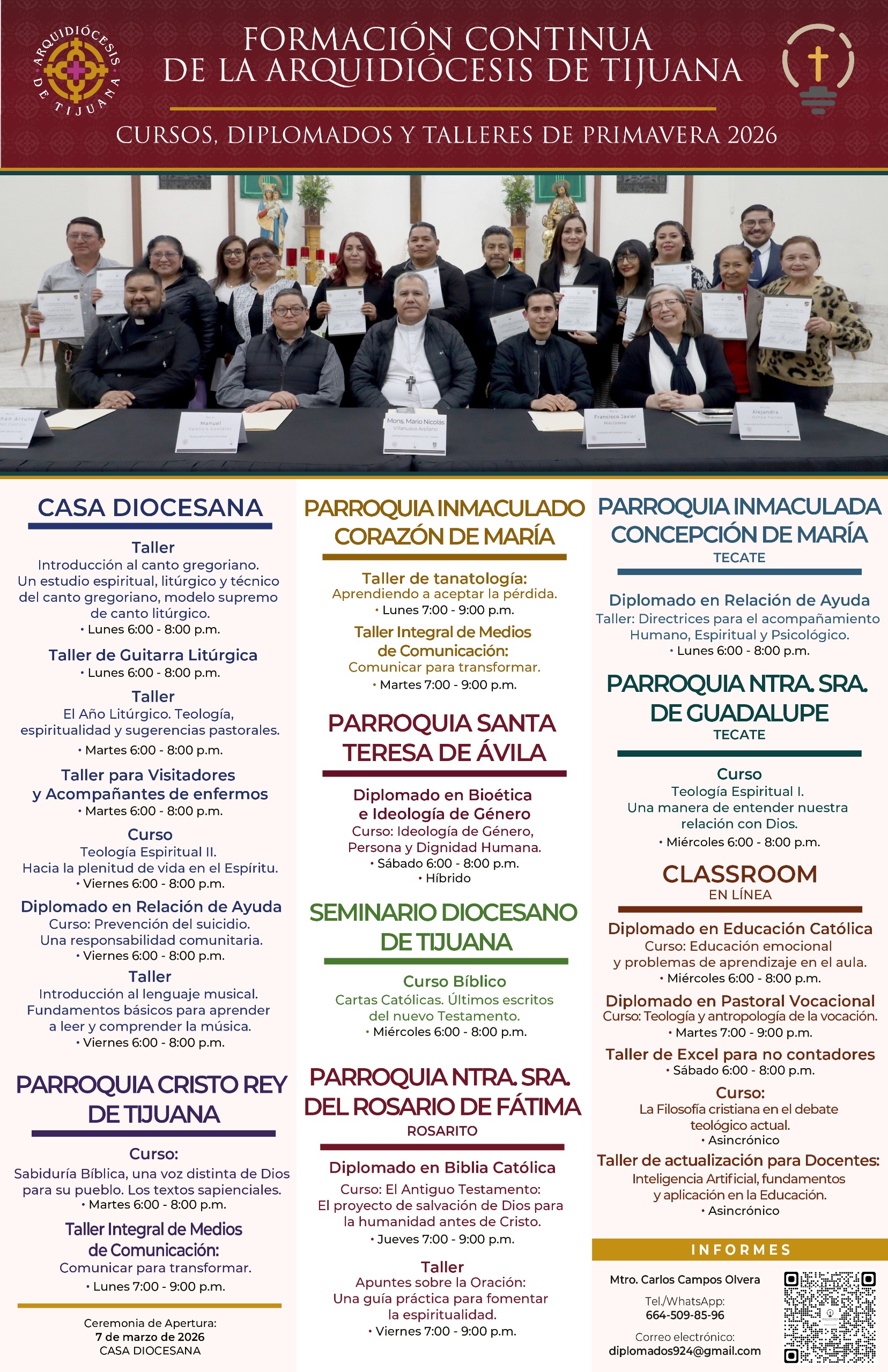 La Formación Continua de la Arquidiócesis de Tijuana invita a sacerdotes, vida consagrada, agentes de pastoral y fieles laicos a participar en los Diplomados, Cursos y Talleres de Primavera 2026, espacios de crecimiento humano, espiritual y pastoral al servicio de nuestra Iglesia particular.